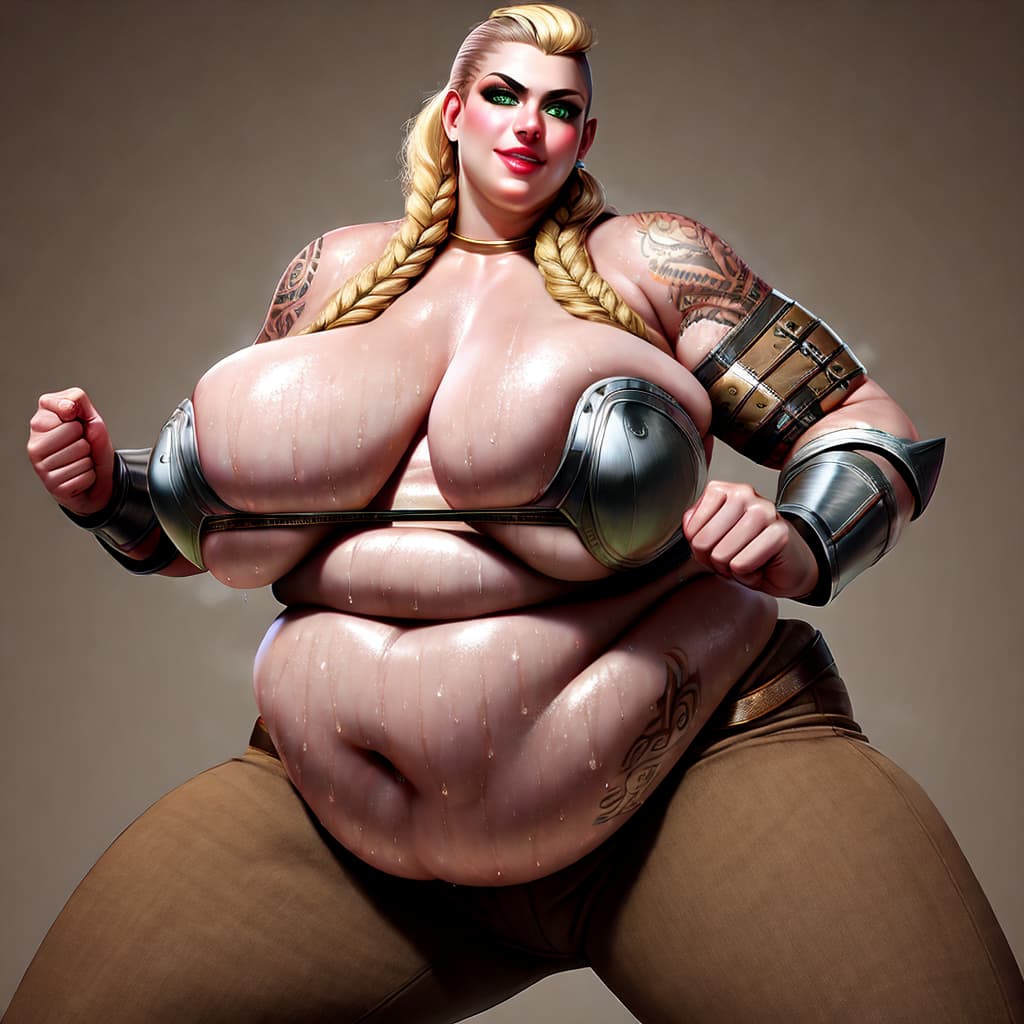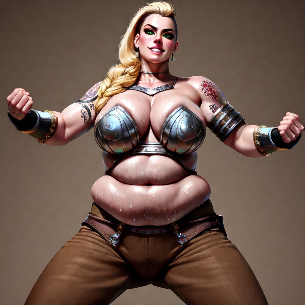 best quality, high rating, solo, (perfect anatomy:1.6), photorealistic, no_background, detailed, gorgeous face, viking, (braided hair:1.2), blonde hair, long hair, (beautiful green eyes:1.2), perfect eyes, (shaved side of head:1.2), viking warrior clothes, metal bra, bracers, (loose brown pants:1.2), (Viking tattoos on arms:1.4), standing, bare arms, front view, obese, double_chin, frontheavy, extra large breasts, heavy breasts, fat rolls, thick thighs, bare belly, legs apart, two fold navel, sagging belly, cleavage_overflow, skindentation, overflowing_breasts, fat_belly, (fighting_stance:1.4), grinning_at_viewer, (sweaty:1.5), fists up