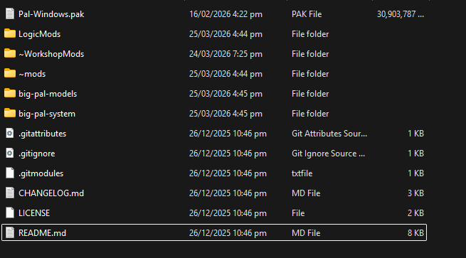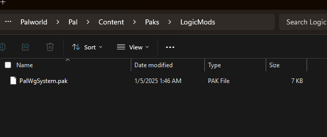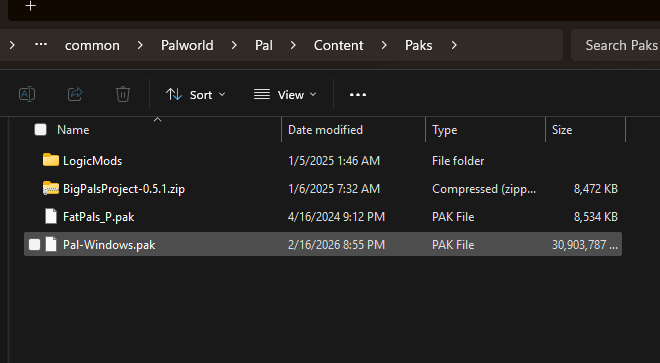 The PalWGSystem.pak should in the the LogicMods folder and you should have FatPals_P.pak in the same directory as Pal-Winodws.pak