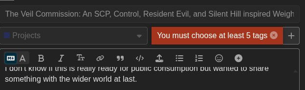 Quick Description: I was editing my top-level post to include a link to an early release of a game. It already has five tags added, but when I try to save my changes I get a pop-up saying I need to add tags.