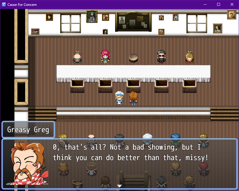 I also got a softlock by losing the eating competition that requires you to join a guild. After the first picture, the game incorrectly reset the room (Mina is missing, Petar is both next to the table and at his seat and two contestants are already down). The third picture happens immediately after the second with no chance to even move, then it just tries to reset the room again with the same result.