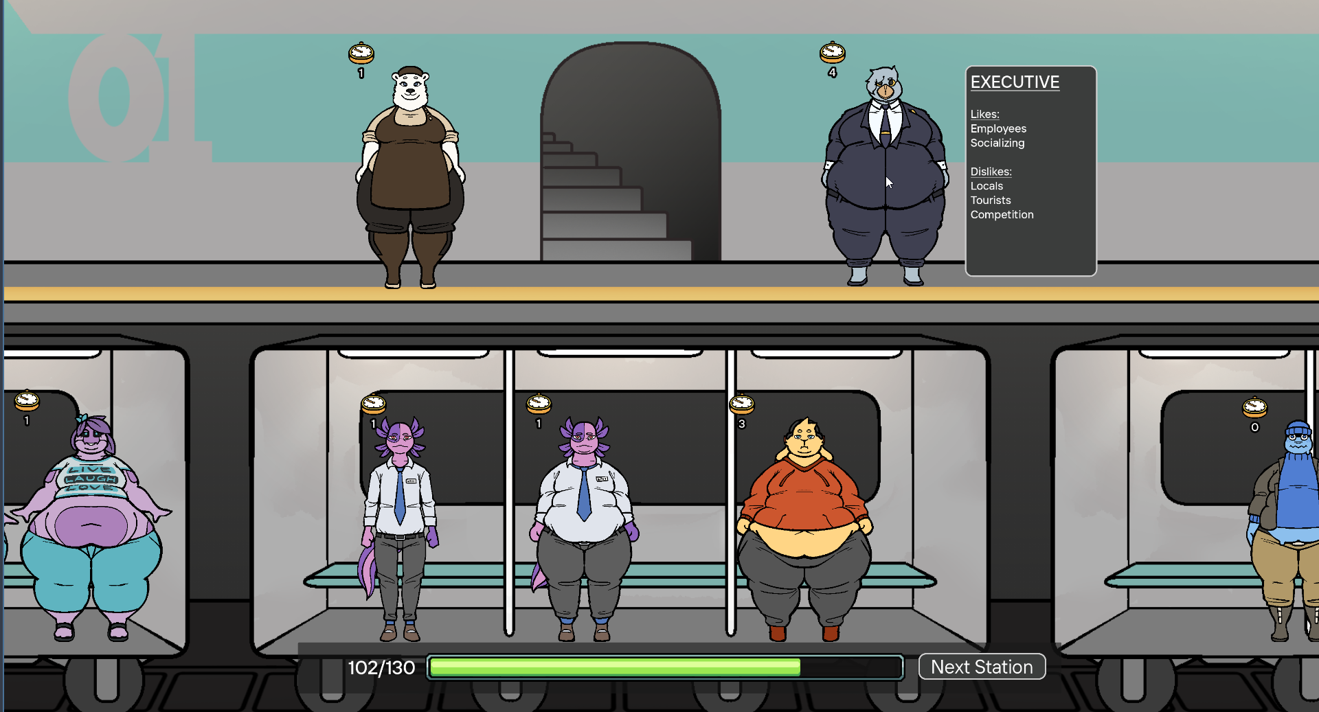 - Speaking of jogger, out of all the passengers, she feels like the biggest liability to actually bring along with you. Unless she’s only going to be around for 1 stop, and you don’t have a dietitian around, she’s just not worth taking with causing point loss with everyone else aboard the subway and not having many ways to generate that many points herself. While I get that she’s mainly for comboing with the dietitian, if you don’t have one around, the points you get in however many stops she’s gonna be there for won’t help if you end up loosing on that stop. Giving her one or two more positive interactions with a different passenger (maybe with introvert or local?) would make her more useful to bring along.