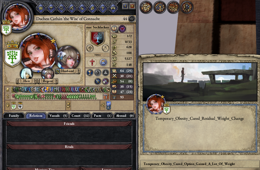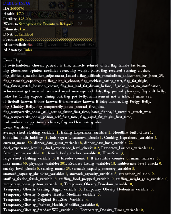 Sort of a random bug report, but I did notice while testing out some events that the end of temporary obesity is a little bugged. It seems like when you either stay immobile for a long time or maybe when you gain a lot of weight from it (Not sure which thing triggers it, but the character was immobile for a long time and did gain a lot), it assigns every fat distribution modifier and every level of them at the same time. Funny to see, but I’m pretty sure that’s unintended.