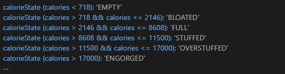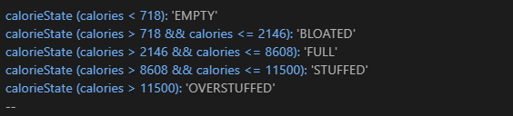 This, my dear, is a very simple block of logic the game employs. It lets it know when Emily has gone through enough calories to warrant some descriptions, or flavor texts, to appear or disappear. Interactions as well! There are, for example, endings you can only access when you are at a certain stage instead of another.