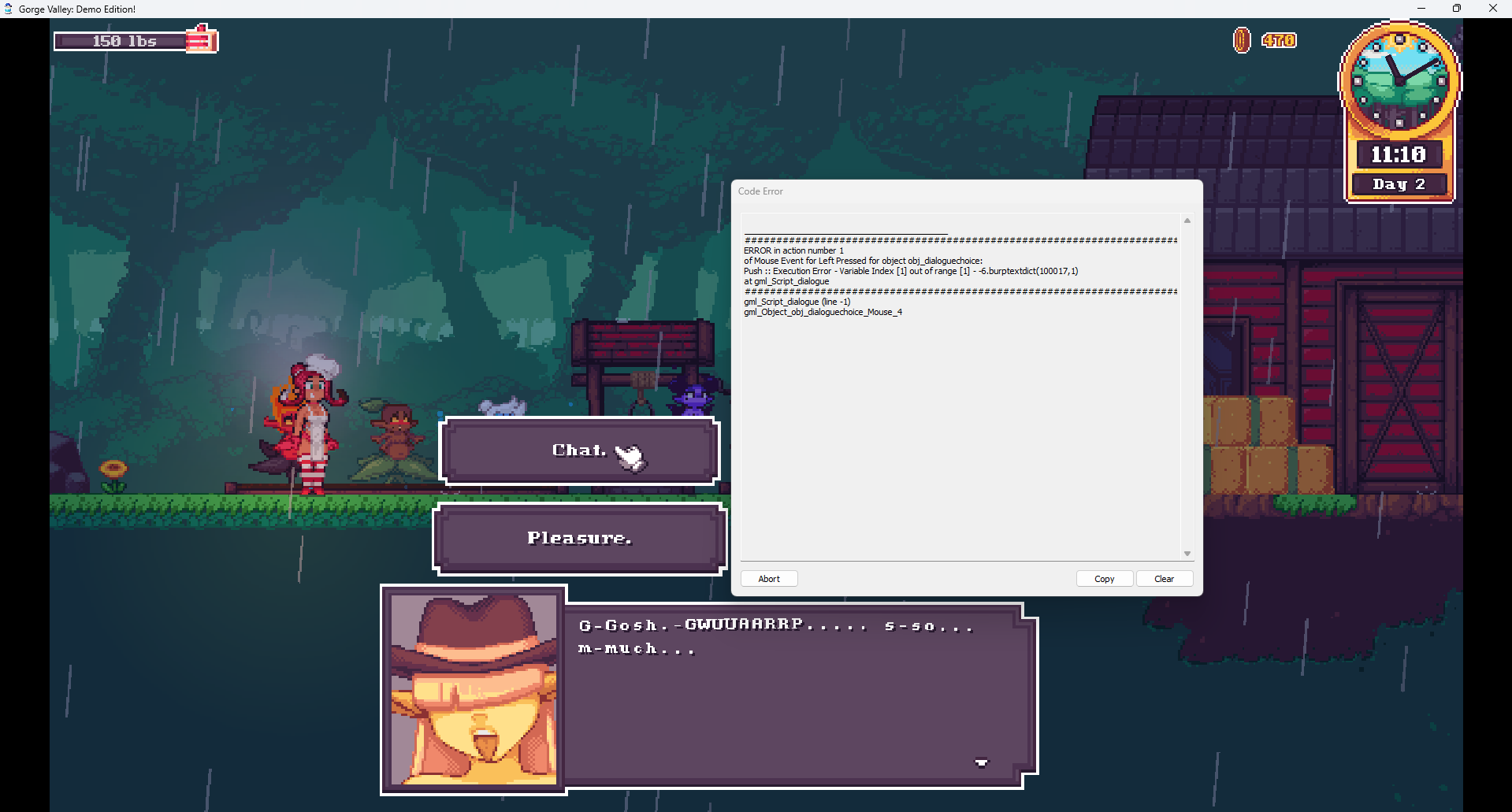 On another play of the demo I did encounter a few errors. Details are below, @Dandy_Chest .