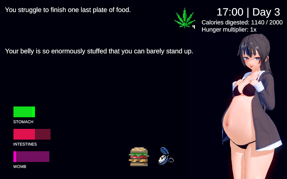 The goal is simple: make her as big as possible. The mechanics, however, are designed to be more complex than just “spam eat until belly meter is full, look for capacity upgrades, get to max size, start gooning”. Key features include: