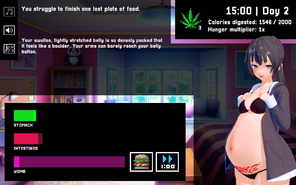 The goal is simple: make her as big as possible. The mechanics, however, are designed to be more complex than just “spam eat until belly meter is full, look for capacity upgrades, get to max size, start gooning”. Key features include: