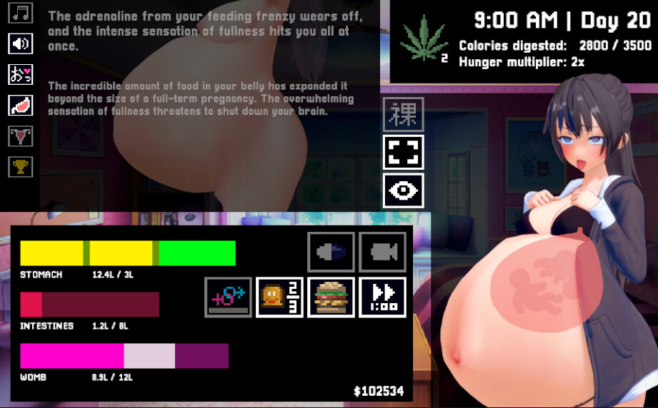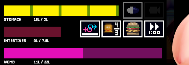 The gameplay itself is pretty simple, and I am trusting the player to be inherently motivated to try to make her belly as big as possible. The mechanics, however, are designed to be more complex than just “spam eat until belly meter is full, look for capacity upgrades, get to max size, start gooning”. Key features include: