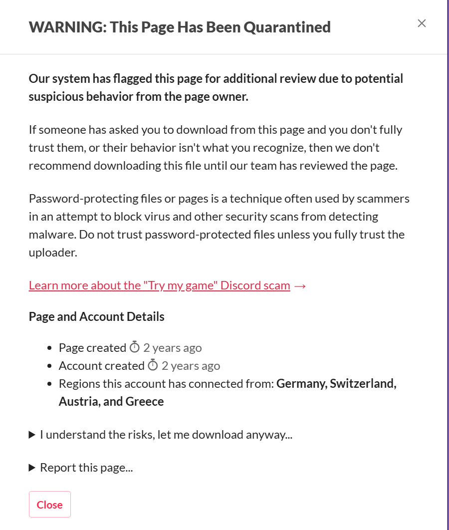 To be fair this just seems like itch flagging something automatically. They do this with a bot to try to protect users from common ‘scam behaviors’ and it’s not an exact science; things often get false flagged when done through bots. They detect behaviors that could mean something is problematic. The devs account and page have existed for 2 years on the site so if the dev is going to different locations and logging into itch. It’s easy to see how it would just get flagged as potential spam. Others seem to have downloaded with no issue and itch has not taken any action against ‘the problem’ so it would seem it’s fine and just a false flag due to how their flagging system works.