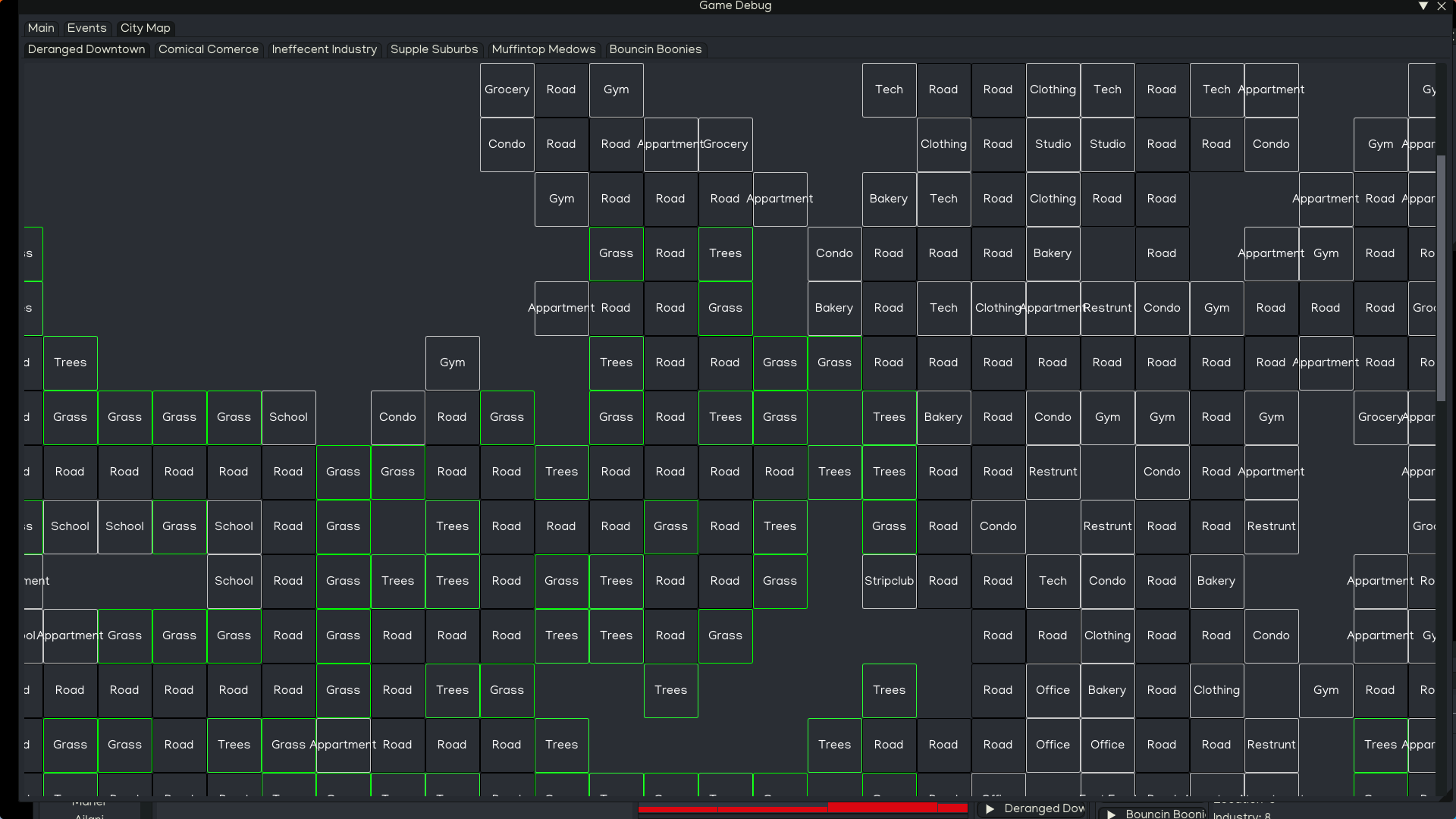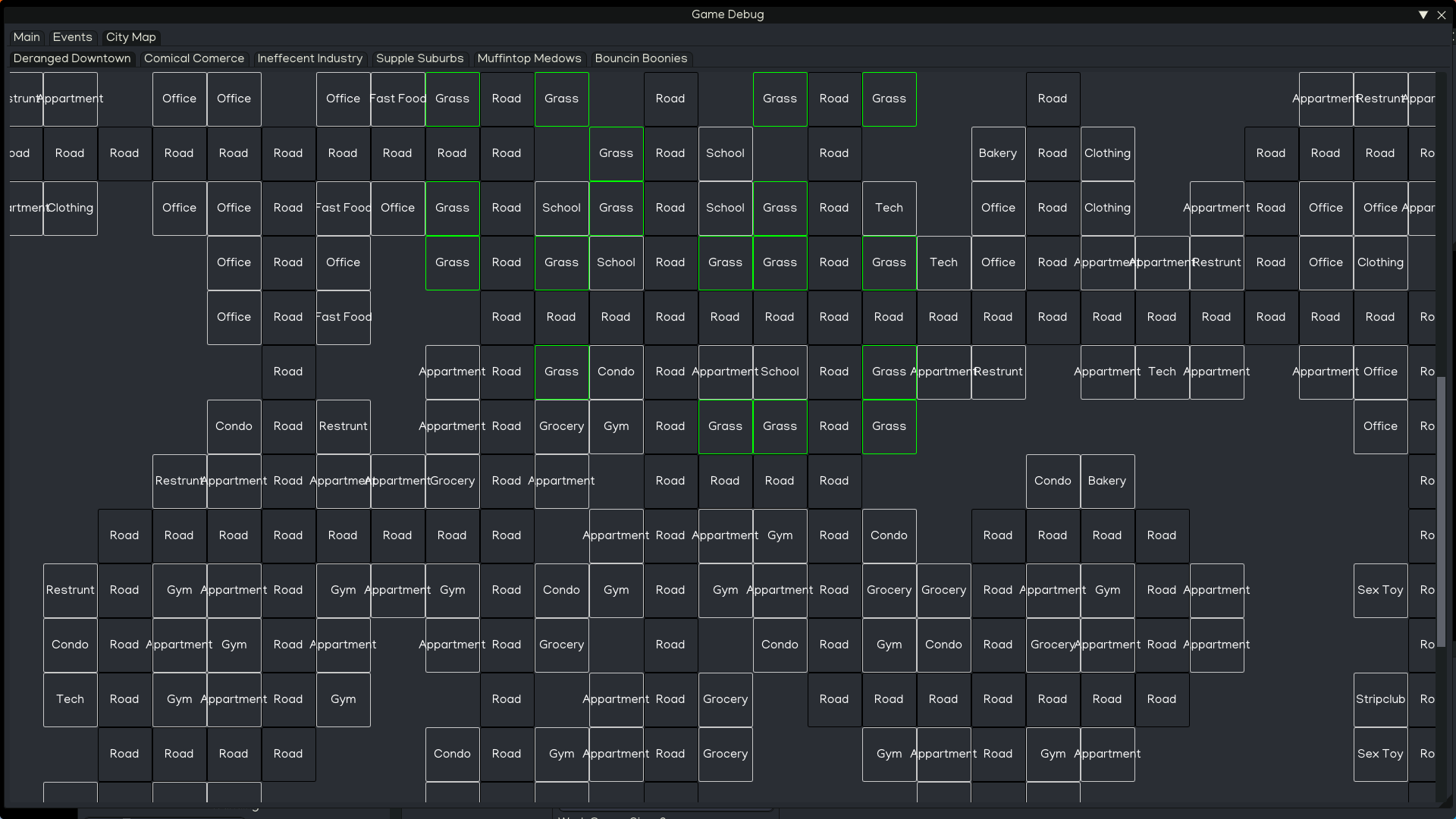 This works almost a bit like the weighted random walk but is more controllable and customizable, and instead of generating roads and using that to inform you city layout it generates the buildings based on rules and then you can block them up with roads.