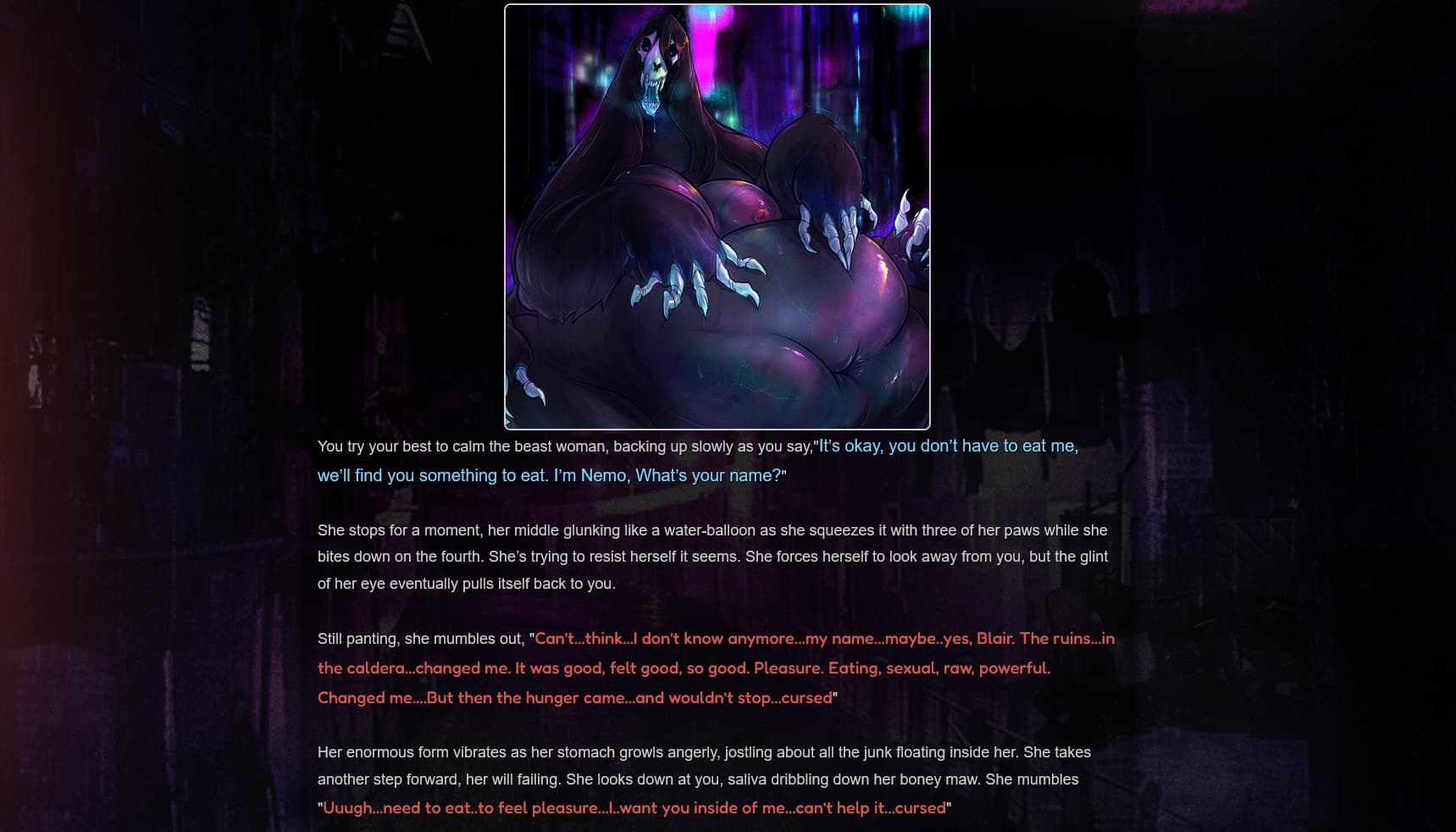 I did notice a bug with the most recent patreon version, and I assume it exists in the current public one as well-giving in to the queen of feasts gives food and calories proportional to your max fullness in an uncapped formula-I ended up with a weight of e86 before I decided I was getting a bit silly. The other options of resisting or pretending to resist, win or lose, does not give this result.