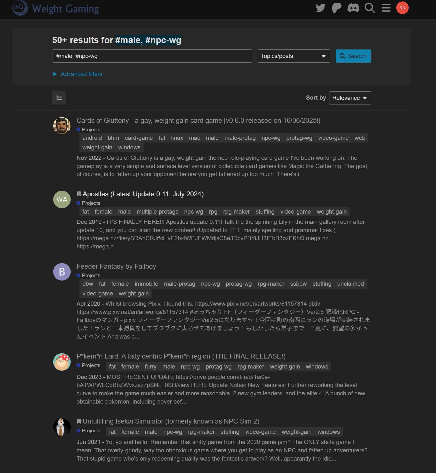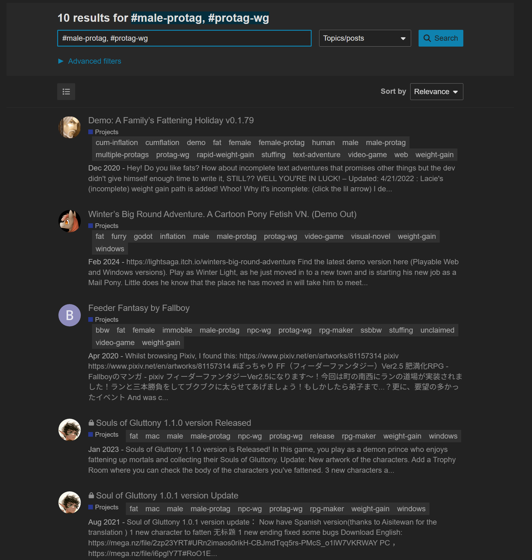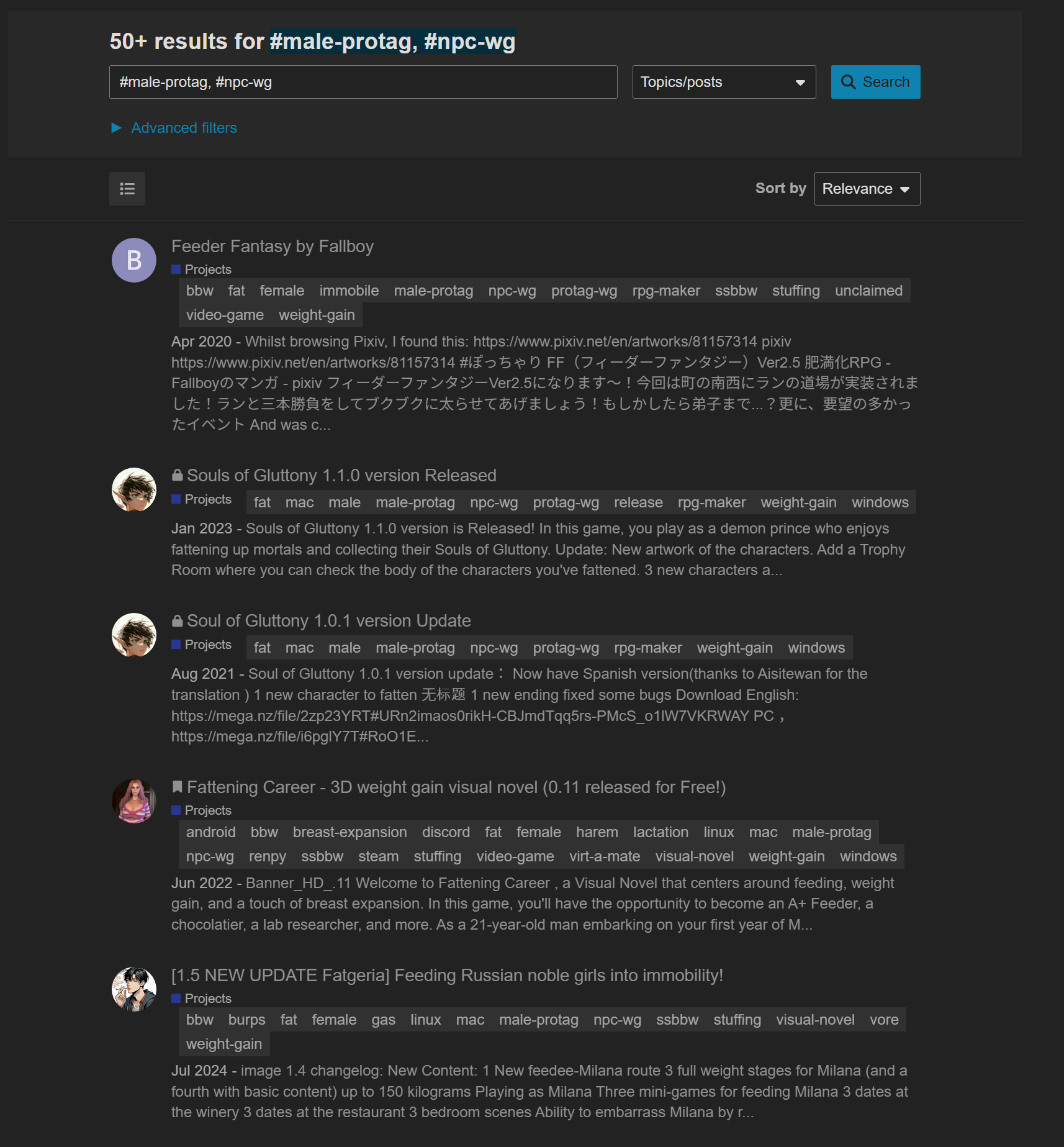 This is why I added things like male-protag, female-protag to tag the place of just tagging something with a male or female tag. As those tags are already not the best way to communicate focus of fetish content. While also adding in tags like npc-wg and protag-wg too try to support the male and female tags. As well as things like bhm or ssbhm to try to make it easier to find content for those interested. The format of discourse and the forum nature is not the easiest setup to display content in the way the site is currently used. Unfortunately there are hundreds and thousands of posts with tags and it’s really important for a dev or post creator to make sure something is tagged correctly. Or it has to be manually gone through and updated, and unless the person updating it knows the exact content of the game this is near impossible to do, unless the first post makes it obvious. For this reason we also rely on the community to help point out, or our trust level 3 regular members to help edit/add tags as they see issues.
