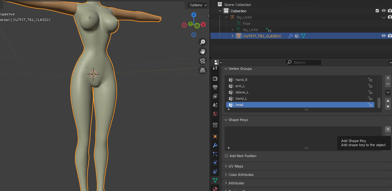 Adding a Shape key to a model is quite simple in Blender. Highlight the model, go to the object data properties tab and there is section called “Shape keys”. To the right, you’ll see a + and - buttons, pressing the + button will add a shape key to mesh you highlight called basis (the base form or your mesh), then add a new shape key that by default will be named “key 1” but you can renamed to anything you want.