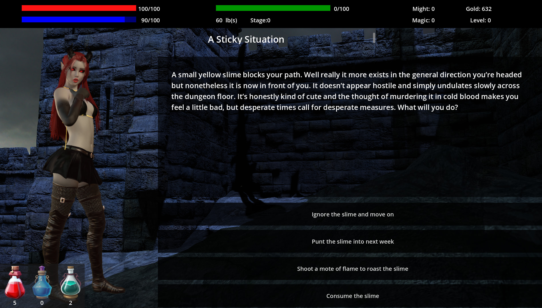 Gameplay wise at least what I was going for was to imagine slay the spire except it’s just the choice based ? events. Kind of visual novel/text adventure-esque where Alara is put into situations as you progress through the dungeon and you have to decide what she does and deal with the consequences. And upon being defeated she flees back to the start of the dungeon and has to restart the run. All the weight and food she consumes along the way is converted to experience when she retreats allowing her to level up and increasing the maximum weight she can achieve.