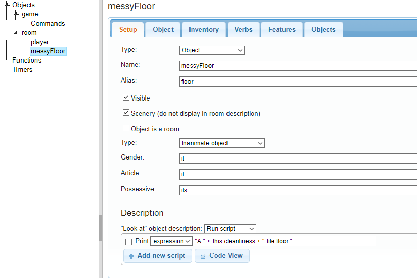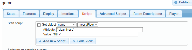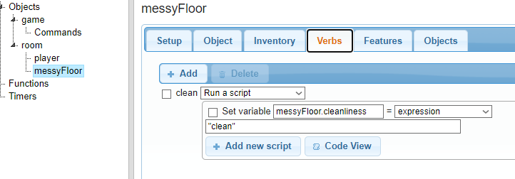 In Quest, you’re going to do a lot of [Setting an attribute] and a lot of if/else statements. In this example, we tested to see if the object messyFloor’s presumably Boolean attribute cleanliness was true or false. Notice that neither true nor false are in quotation marks; that is because they are hard-coded, unlike strings. If we were testing for Strings on a String attribute, it might look like: