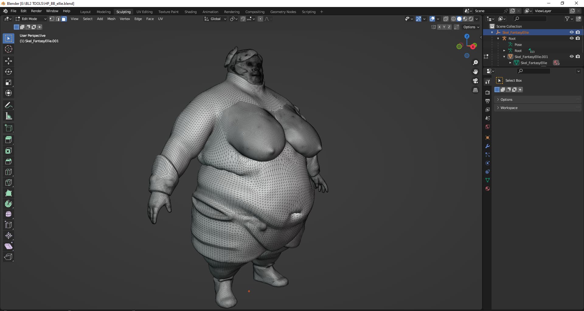I used the inflate tool mostly for the legs, cleavage and the face, but the clothes don’t react well to inflating so in those areas i used the grab brush and slowly pulled the mesh outwards, taking extra care not to missalign limbs and mess up animations.