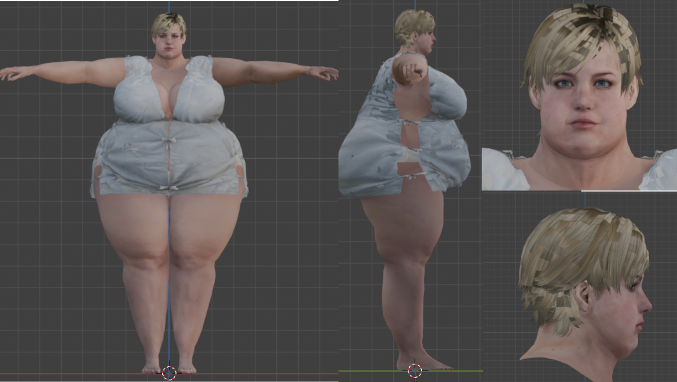I’ll be doing the 2, 3 and 4 remakes mods, just going to spoil tag this one because not everyone like this, for RE2R and RE4R I will make Leon fat but I’m not certain to upload it here as some people find it disturbing or some sort; I do make fat male mods privately except in my LAD thread for Tsukino’s twin brother. Although I will make female mods like the usual but expect clipping as I don’t have an expensive software like 3DSMax and ZBrush.