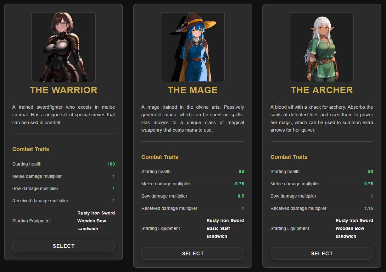 There are now three characters you can pick from when starting a new game, each with a unique attribute. Each character has a unique set of images and weight descriptions (meaning two new sets from before). Each class also has two sub-class abilities you can choose from around the halfway point of the game.