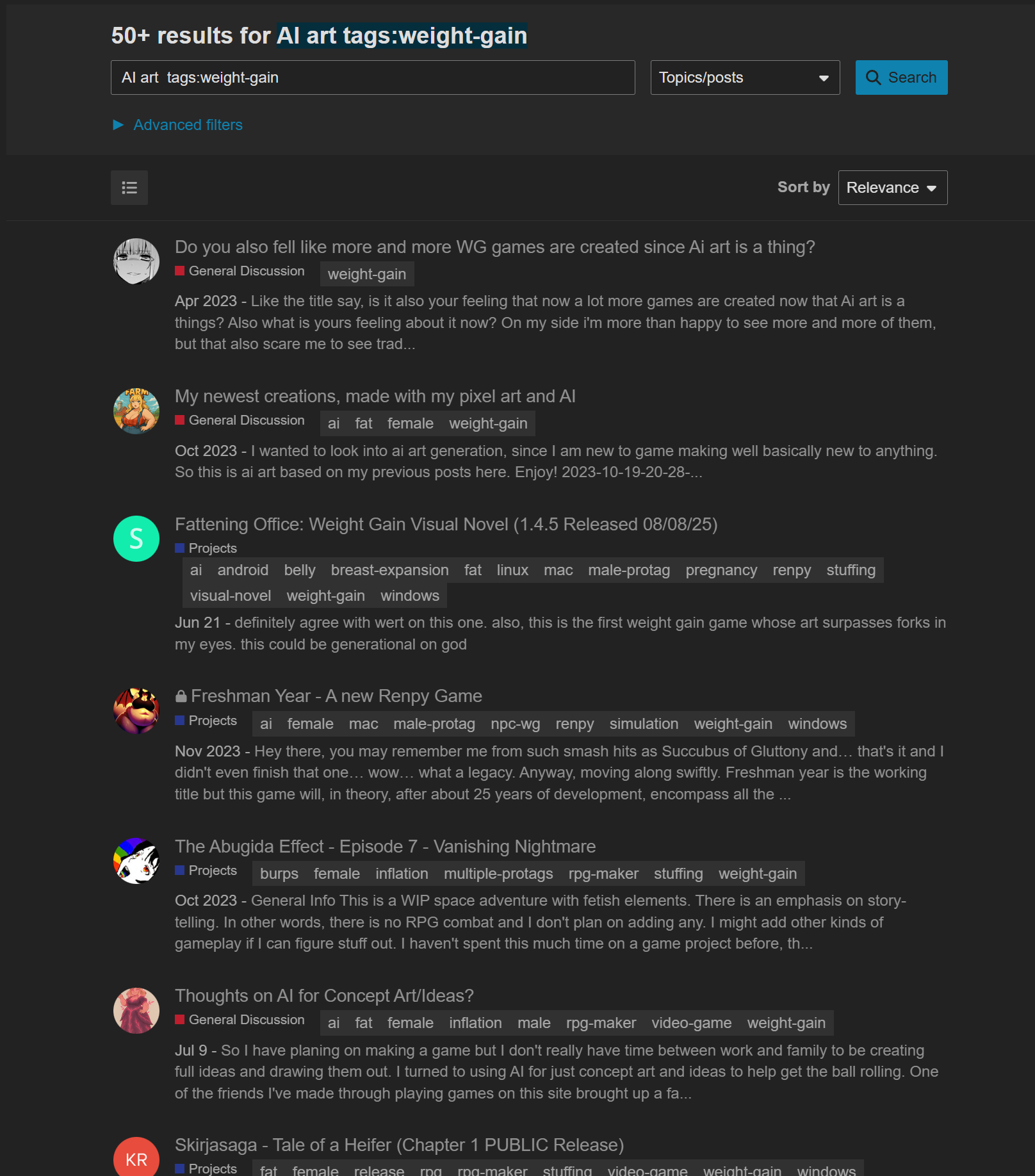 Nothing against RPG-maker games, and I do have something against AI games, but fuck are there a lot of both of them. I think there should be a way to filter topics out during a search, and if there already is, please tll me how to do it.