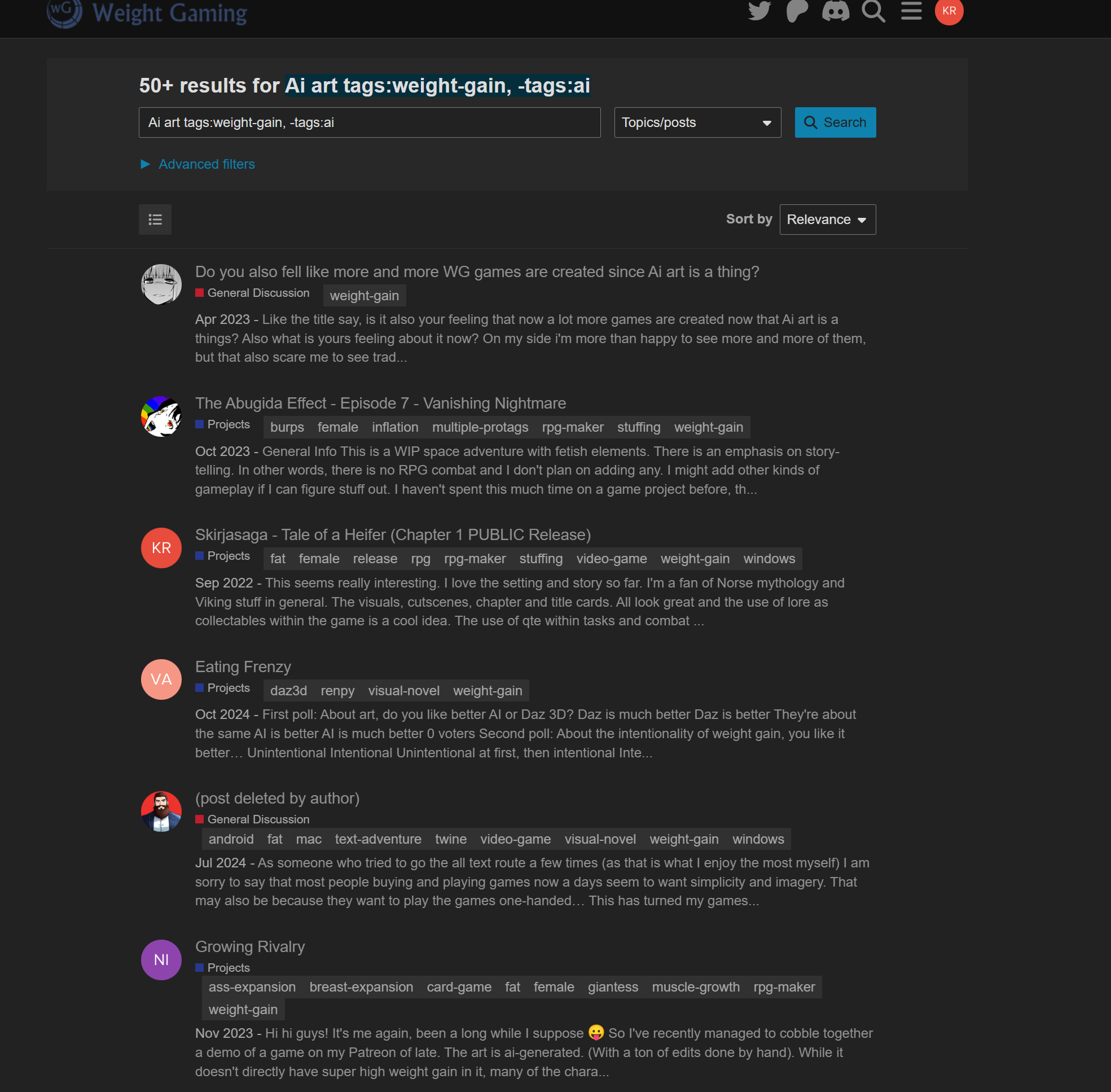 You can also do multiple tags by added a comma after the tag with no space and then another tag. tags:weight-gain,rpg-maker including be able to filter looking for a specific tag, and filter out another in the same search. For instance AI art tags:weight-gain, -tags:ai