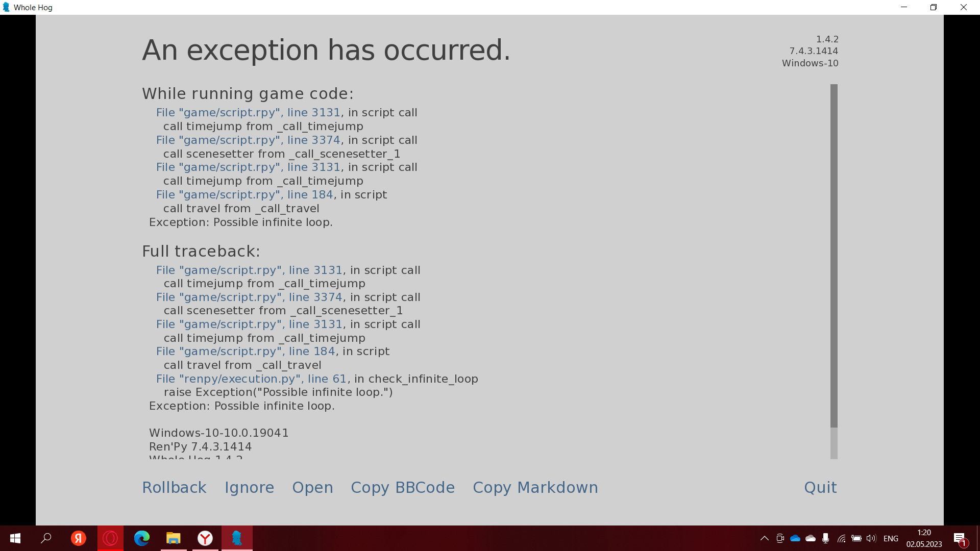 This is the error I was referring too, the infinite loop. I have a fix in mind but it involves restructuring parts of the day cycle. This in of itself will lead to lots of recoding so I am hoping to have a patch for the infinite loop next week.