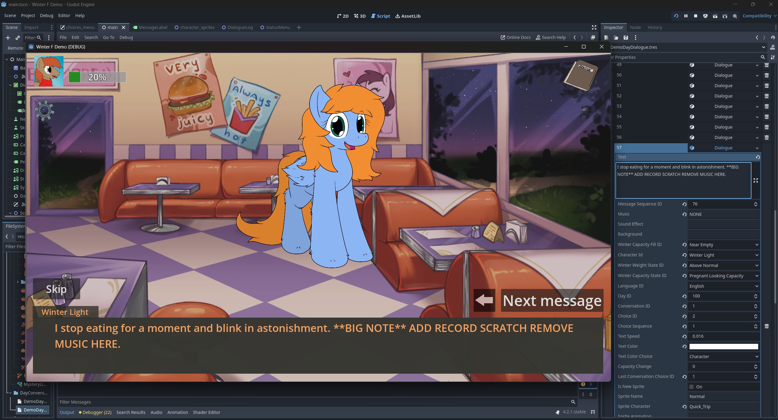 Anyways, not much to report, as the next big chunk of time I’m using is pretty much adding the leftover dialogue for the demo inside the game, along with all the music/sounds/sprite changes/images, etc. Here’s another screenshot, this time with more of my tools open on screen, as I’m debugging the game, just for those interested on the behind the scenes.