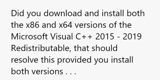 I did some of my own research and found that the way to respolve this for UE4 programs is to repair any existing builds of the redistributable. I already have the 2017 builds, which–from what I can tell–are identical to the '15 and '19 builds. I repaired both builds and…nothing. Still get that error.